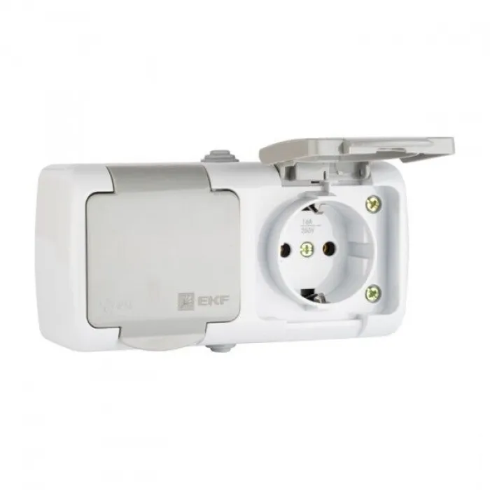 Розетка двухместная EKF МУРМАНСК, открытый монтаж, с заземлением, с крышкой, со шторками, серый, EFR16-129-30-54, Нижний Новгород