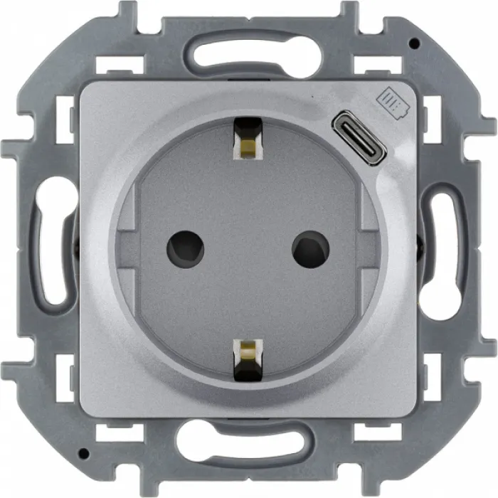 Розетка 2К+З немецкого стандарта 16А 250В с встроенным зарядным устройством USB C 1.5А 5В - INSPIRIA - алюминий - это стильное и функциональное электрическое устройство, которое сочетает в себе высокое качество материалов и современные технологии.Эта розетка имеет два контакта для подключения электрических устройств, а также заземляющий контакт для безопасности. Встроенное зарядное устройство USB C позволяет быстро и удобно заряжать мобильные устройства, такие как смартфоны и планшеты.