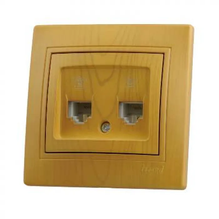 Розетка телефонная двойная (евро). Изделия с расцветкой «под дерево» изготовлены из покрашенного «под фактуру» пластика, а не оклеены цветной пленкой. Безопасные для рук крепежные выступы с пружиной и возвратом в исходное положение. Серебряные контакты, выполнены по стандарту из сплава. Опорна плата с маркировкой, на все изделия нанесены схемы электрического соединения. Надежные соединения с помощью шайб с насечкой. Простой монтаж и демонтаж. Нержавеющий металлический каркас. Защита пальцев. На
