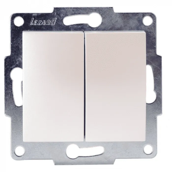 Механизм выключателя 2-клавишный KARINA с номинальным током 10А и степенью защиты IP20. Цвет корпуса - жемчужно-белый перламутр, что придает изысканный и стильный вид. Производитель Lezard. Механизм предназначен для установки внутри помещений. Имеет две клавиши для управления освещением или другими электрическими устройствами. Компактный и надежный механизм для повседневного использования.