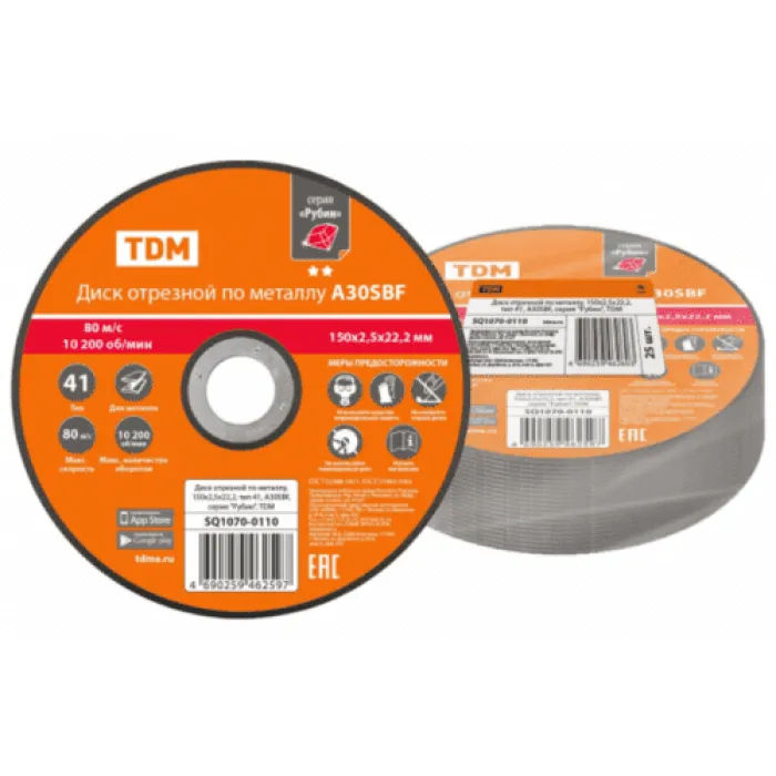 Диск отрезной по металлу, 150х2,5х22,2, тип 41, A30SBF, серия Рубин, TDM - это высококачественный инструмент, предназначенный для профессиональной обработки металла. Диск имеет диаметр 150 мм, толщину 2,5 мм и отверстие диаметром 22,2 мм, что позволяет легко и точно отрезать металлические детали.Диск отрезной типа 41 имеет форму плоского круга и предназначен для работы с угловыми шлифовальными станками. Он обладает высокой прочностью, устойчивостью к износу и долговечностью, что позволяет использовать его в тяжелых условиях эксплуатации.