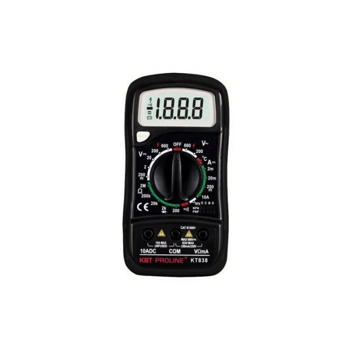 Мультиметр цифровой серии «PROLINE» KT838 PROLINE - это высококачественный и надежный прибор для измерения различных параметров электрических цепей. Он отличается точностью измерений, удобством использования и широким функционалом. Мультиметр KT838 PROLINE подходит как для профессиональных электриков, так и для любителей. С его помощью можно измерять напряжение, ток, сопротивление, ёмкость, частоту, температуру и другие параметры. Компактный дизайн, большой ЖК-дисплей, автоматическое отключение и другие удобные функции делают этот мультиметр незаменимым инструментом в электротехнике.
