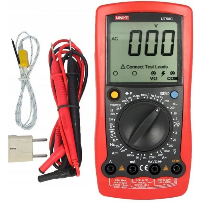 Мультиметр UT58C универсальный - это надежный и удобный в использовании прибор для измерения различных параметров электрических цепей. Он обладает широким диапазоном измерений, включая напряжение, ток, сопротивление, ёмкость, частоту и температуру.UT58C оснащен большим ЖК-дисплеем, который обеспечивает четкое отображение измеряемых значений. Благодаря компактному и прочному корпусу, мультиметр удобно брать с собой в походы или на производство.