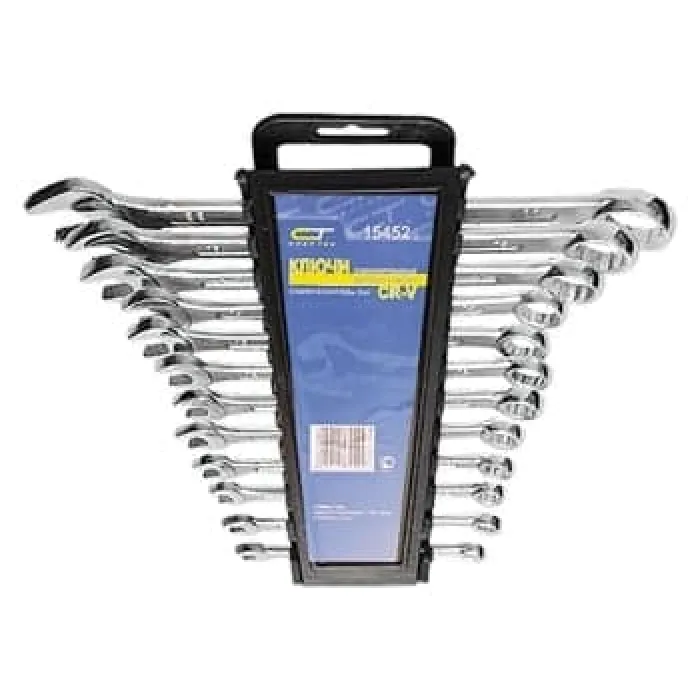 Ключи изготовлены из хромванадиевой стали. Твердость материала рабочей части ключа 45 HRc (требования ГОСТ – 45–51 HRc). Ключи имеют хромированное покрытие. Профиль кольцевого зева имеет 12 граней, что увеличивает площадь соприкосновения рабочих поверхностей и снижает риск деформации граней крепежа при монтаже. Угол наклона кольцевого зева относительно плоскости ключа в 15 градусов делает монтаж более удобным. Ключи поставляются в комплекте с трапециевидным пластмассовым держателем. Набор предна
