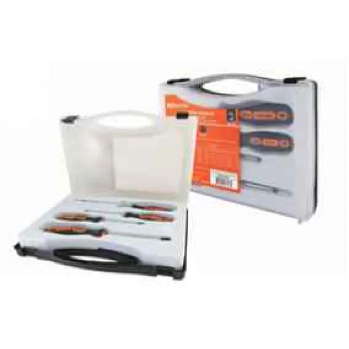 Набор включает в себя отвертки следующих размеров: SL:3x75, 5х100, PH:1х75, 2х100. Все отвертки удобно хранятся в пластиковом чемодане, который обеспечивает их защиту от повреждений и легкий транспорт.