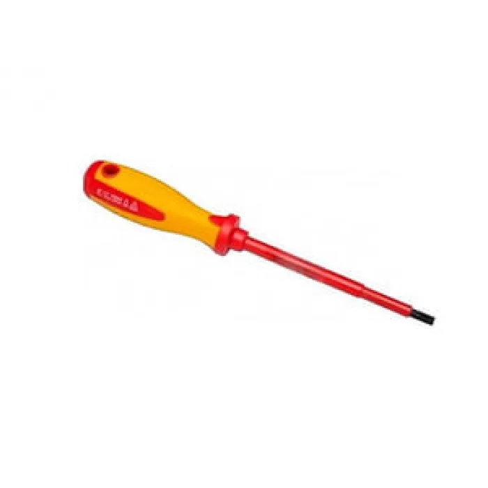 Отвертка шлицевая диэлектрическая SL 4x100мм, 1000 В, Insulated CrMo, двухкомп.рукоятка// MATRIX PROFESSIONAL 12916 - это профессиональный инструмент для работы с электрическими устройствами под напряжением до 1000 В. Изготовлена из хром-молибденовой стали для повышенной прочности и долговечности. Рукоятка инструмента выполнена из двухкомпонентного материала для удобного и надежного хвата. Предназначена для работы с винтами со шлицевой головкой размером 4 мм и длиной 100 мм. Подходит как для профессионального использования, так и для домашнего ремонта.