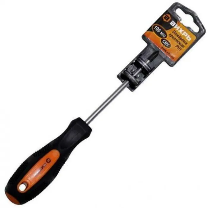 Отвёртка крестовая PH1, 100 мм Вихрь - надежный инструмент для затягивания и отворачивания крепежных элементов с крестовым шлицем. Изготовлена из высококачественной стали, что обеспечивает прочность и долгий срок службы. Длина отвёртки составляет 100 мм, что делает её удобной для работы в труднодоступных местах. Имеет эргономичную рукоятку для удобного и комфортного использования. Подходит для профессионального использования и для ремонта в быту.