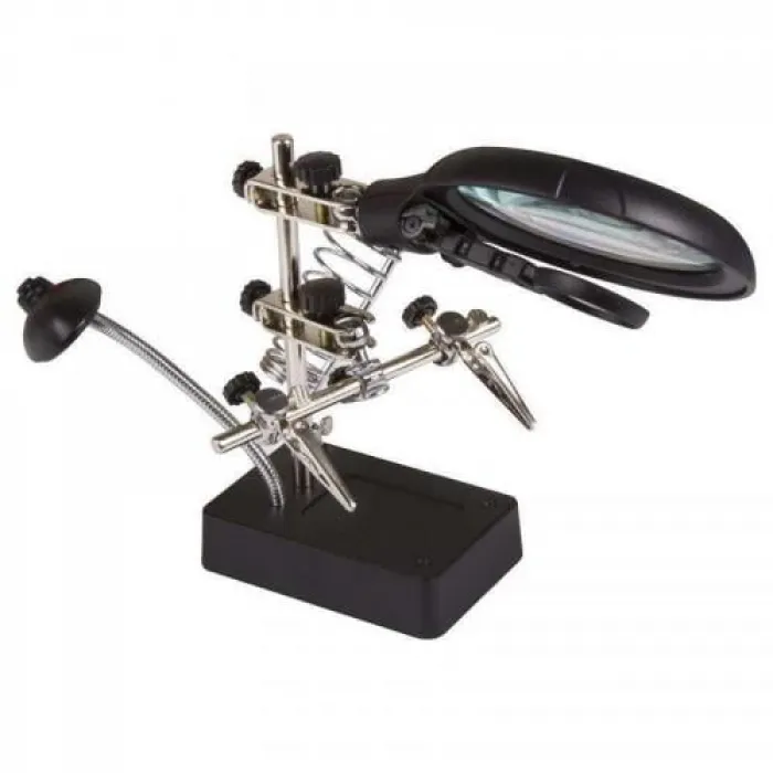 Держатель третья рука с лупой х2.5, подставка под паяльник и LED подсветкой Rexant 12-0250 - это удобное и многофункциональное устройство для проведения точных работ, таких как паяние, ремонт мелких деталей или создание ювелирных изделий. Оно обеспечивает стабильную и безопасную платформу для вашего паяльника и других инструментов, освобождая ваши руки для более точной работы.Основные характеристики: