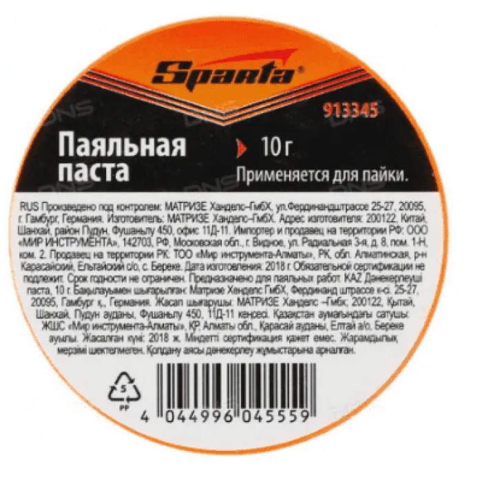 Паста паяльная SPARTA 913345 представляет собой специальное средство для облегчения процесса пайки. Ее удобно наносить на поверхность металла перед пайкой, что позволяет улучшить контакт и уменьшить вероятность появления нежелательных дефектов. Паста имеет вес 10 грамм, что обеспечивает достаточное количество для проведения нескольких пайочных работ. Продукт отличается высоким качеством и надежностью, что делает его незаменимым инструментом для профессиональных мастеров и любителей электроники.