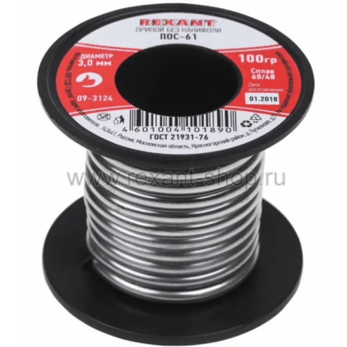 В нашем магазине Главэлектрика в Нижнем Новгороде, вы можете приобрести с доставкой по Нижнему Новгороду товар Припой катушка ПОС-61 без канифоли (Ø3,0мм, 100гр) REXANT.