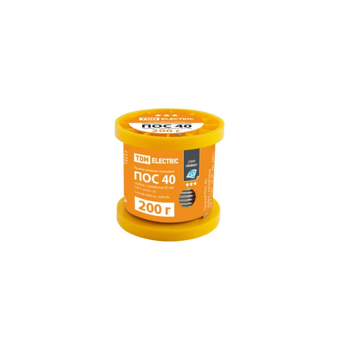 В нашем магазине Главэлектрика в Нижнем Новгороде, вы можете приобрести с доставкой по Нижнему Новгороду товар Припой ПОС 40, трубка с канифолью, ГОСТ 21931-76, Ø1 мм, 200 г, катушка, серия "Алмаз" TDM.