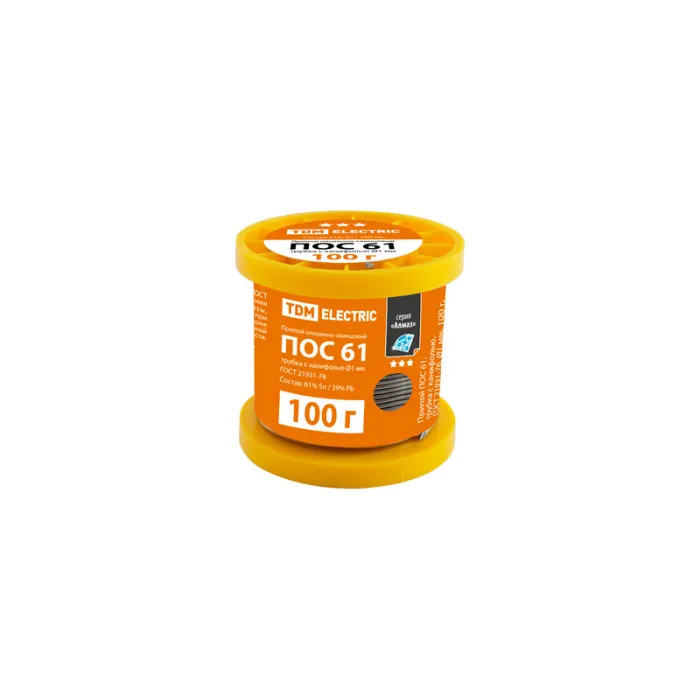 Припой ПОС 61, трубка с канифолью, ГОСТ 21931-76, Ø1 мм, 100 г, катушка, серия "Алмаз" TDM, Нижний Новгород