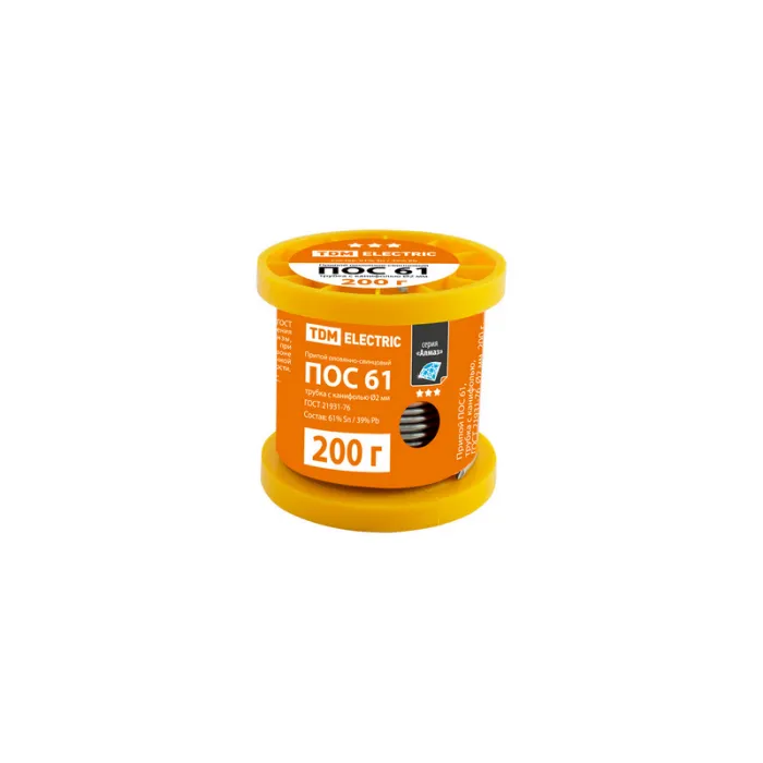 Припой ПОС 61, трубка с канифолью, ГОСТ 21931-76, Ø2 мм, 200 г, катушка, серия "Алмаз" TDM, Нижний Новгород