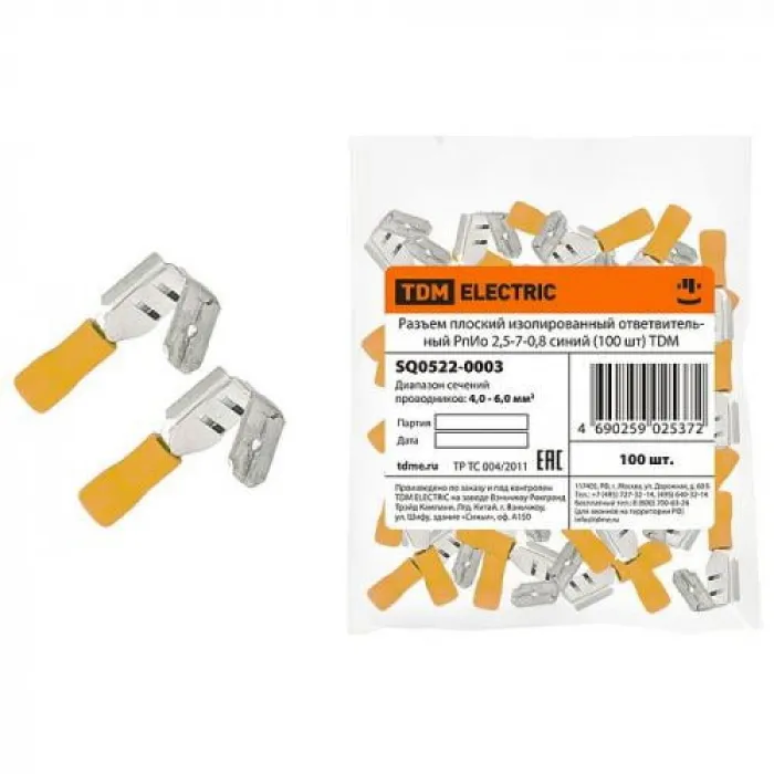 В нашем магазине Главэлектрика в Нижнем Новгороде, вы можете приобрести с доставкой по Нижнему Новгороду товар Разъем РПИ-О 2,5-7-0,8 плоский желтый (100 шт) TDM.