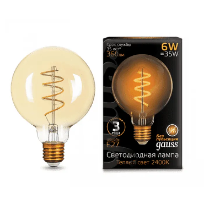 Gauss Лампа LED Filament G95 Flexible E27 6W Golden 2400К 1/20 Мощность лампы6 Вт