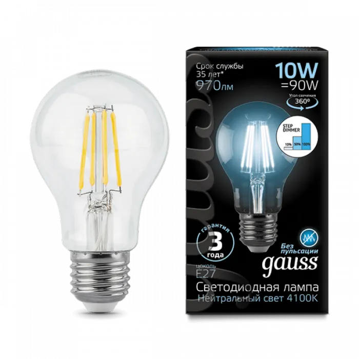 Лампа филаментная диммируемая светодиодная Gauss A60 10Вт 4100К E27, 102802210-S, Нижний Новгород