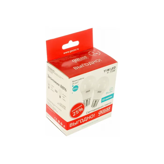 Лампа светодиодная Gauss A60 11Вт 230в E27 белый (2шт в упак), 23221P - это набор из двух энергоэффективных светодиодных ламп, которые обеспечат яркое и равномерное освещение помещения. Лампы имеют цоколь E27, что делает их универсальным вариантом для большинства светильников. Благодаря низкому энергопотреблению 11Вт и длительному сроку службы, эти лампы помогут сэкономить электроэнергию и долгое время будут радовать ярким белым светом. Они идеально подходят для использования в доме, офисе или других коммерческих помещениях.