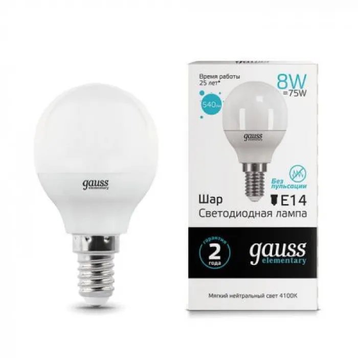 Лампа светодиодная Gauss G45 (Шар) Elementary Globe 8W E14 4100K, 53128, Нижний Новгород