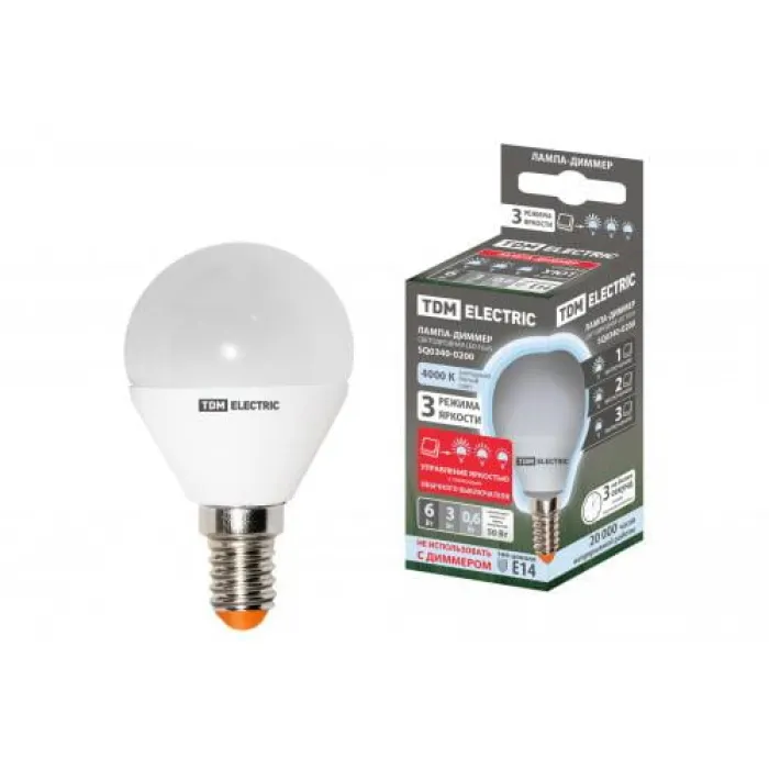 Лампа светодиодная (LED) «шар» d45мм E14 270° 6Вт 220-230В матовая нейтральная холодно-белая 4000К диммируемая TDM ELECTRICшаговое димирование, 3 режима