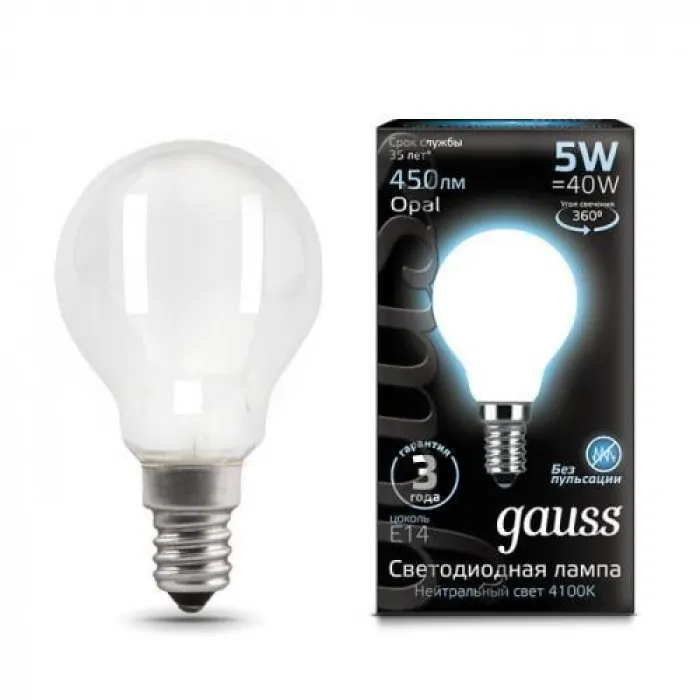 Лампа филаментная светодиодная Gauss G45 (Шар) Globe OPAL E14 5W 4100K, 105201205, Нижний Новгород