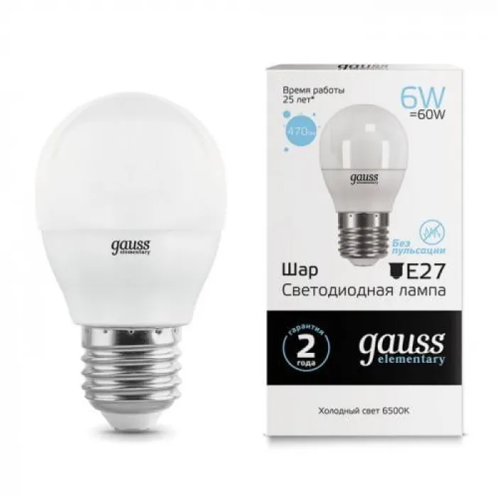 В нашем магазине Главэлектрика в Нижнем Новгороде, вы можете приобрести с доставкой по Нижнему Новгороду товар Лампа светодиодная Gauss G45 (Шар) Elementary Globe 6W E27 6500K, 53236.