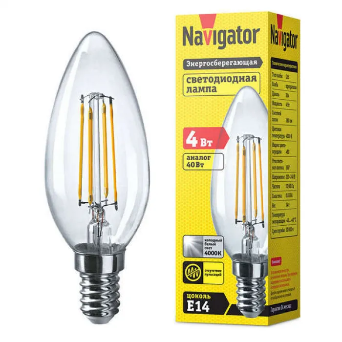 В нашем магазине Главэлектрика в Нижнем Новгороде, вы можете приобрести с доставкой по Нижнему Новгороду товар Лампа филаментная светодиодная Navigator свеча NLL-F-C35-4-230-4K-E14, 61339.