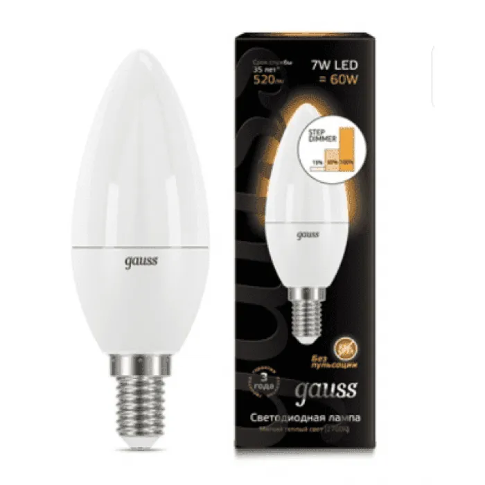 Лампа шагового диммирования светодиодная Gauss свеча LED Candle E14 7W 2700К шаговое димирование, 103101107-S, Нижний Новгород