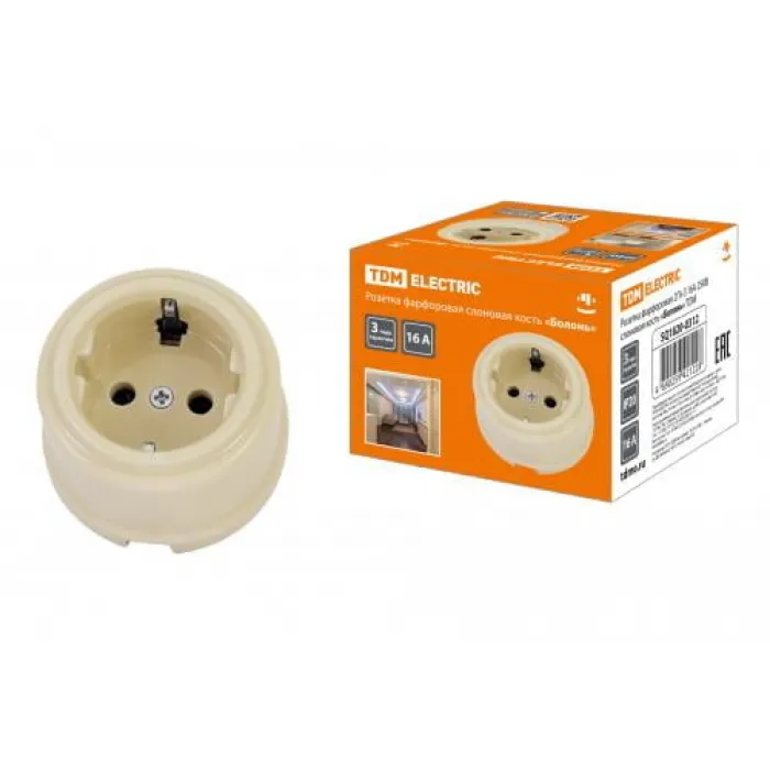 Фарфоровая розетка 2П+З 16А 250В слоновая кость «Болонь» TDM - это элегантное и стильное электрическое устройство, которое сочетает в себе высокое качество и привлекательный дизайн. Розетка изготовлена из прочного фарфора, который придает ей особую изысканность и устойчивость к повреждениям.Эта розетка имеет два контактных отверстия и заземляющий контакт, что обеспечивает безопасное подключение электроприборов. Рассчитана на номинальное напряжение 250В и ток 16А, что позволяет использовать ее для подключения различных бытовых устройств.