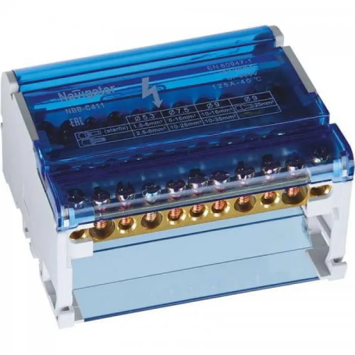 Стандартные нулевые шины Navigator серии NBB. Нулевые шины предназначены для электрического и механического соединения нулевых рабочих (N) и нулевых защитных (PE) проводников, и представляют из себя целиковую латунную планку с отверстиями и винтовыми прижимами. Как правило, нулевые шины крепятся в распаячных коробках или распределительных щитках.