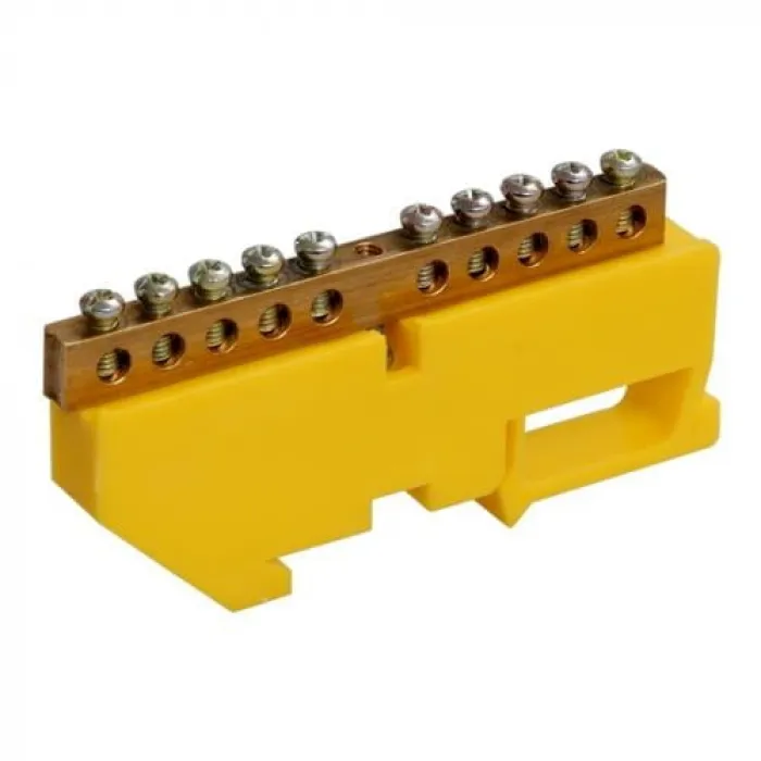 Шина PE земля на DIN-изоляторах ШНИ-6х9-14-Д-Ж (YNN10-69-14D-K05) Применяются в щитовом оборудовании для подсоединения нулевых рабочих (N) и нулевых защитных проводов (РЕ). Крепление шины предусмотрено по центру (типы 8/1, 14/1) и по краям (типы 8/2 и 14/2) через изолятор нулевой шины на 35 мм монтажную DIN-рейку и через угловые изоляторы нулевой шины, а также непосредственно на панель щита. При подключении к шинам медных многожильных проводов рекомендуется оконцевание их наконечниками-гильзами. Выполнены из латуни.