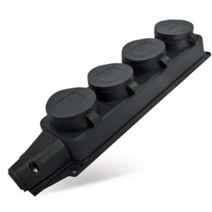 Четверная каучуковая колодка с заглушками - силовой разъем для создания надежных и защищенных соединений. Изделие дает возможность подключения одновременно трех электроприборов вне помещения, например: строительного оборудования, электроинструмента, приборов электроснабжения и пр.
