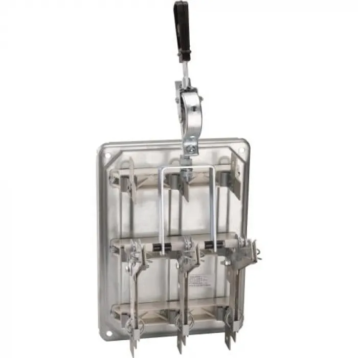 Выключатель-разъединитель 3 полюсный на номинальный ток 400 А, номинальный условный ток короткого замыкания Iq 30 (кА), где установлена центральная рукоятка, а максимальное сечение присоединяемых медных шин составляет 240 кв. мм.