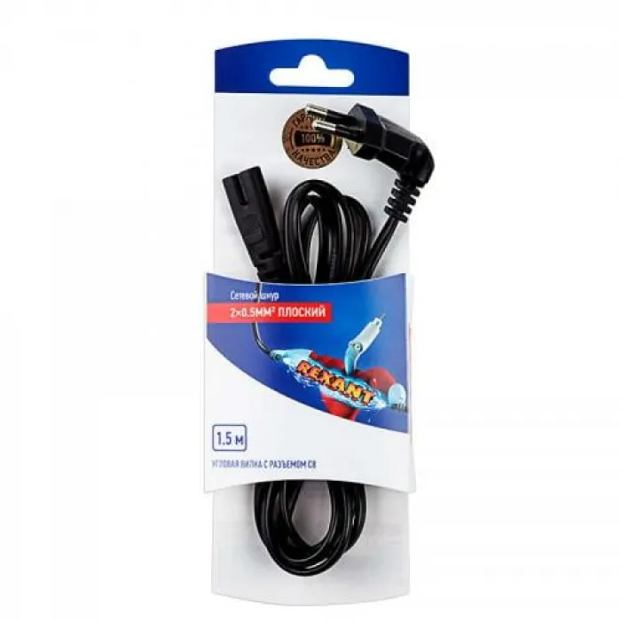Шнур сетевой (угловая вилка) 2x0.5мм² 1.5М REXANT предназначен для подключения к сети переменного тока (AC) с напряжением 220B аудио-, видеоаппаратуры, источников питания ноутбуков, игровых консолей и других приборов, имеющих штыревой сетевой разъем типа С8 (известен из-за его формы как "восьмёрка"). Данный сетевой шнур (IEC cord) состоит из двухжильного провода с сечением жил 0.5мм², с одной стороны угловой литой плоской вилки (Евро) и с другой литого гнездового неполяризованного разъёма типа C7 (евро-разъём). Основные характеристики:- тип вилки Евро угловая;