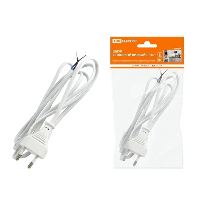 Шнур сетевой без выкл. 1,7 м с плоск. вилкой без з/к ШВВП 2х0,75мм2 ШУ02 белый TDM , Нижний Новгород