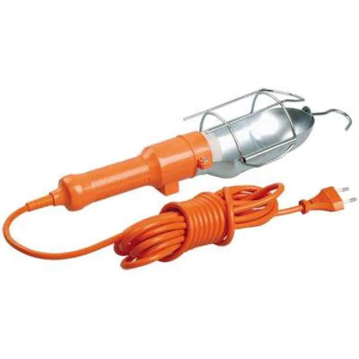 Светильник снабжен металлическим отражателем с антикоррозийным покрытием, удобным выключателем и крюком для подвеса, корпус переносного светильники изготовлен из пластмассы оранжевого цвета.