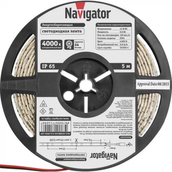Светодиодная лента Navigator IP65 12V 9.6Вт/м 4000К NLS-3528W120 СД (5м), 71409 легко монтируется и устанавливается благодаря гибкости и самоклеющейся основе. Длина в 5 метров позволяет адаптировать ее для разных проектов, будь то подсветка мебели, стен или потолка.