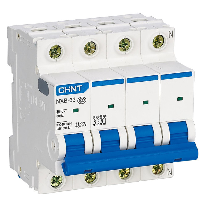 Автоматический выключатель модульного типа производства известной компании CHINT серии NXB-63 предназначен для управления нагрузкой и защиты электрических цепей от сверхтоков: перегрузки и короткого замыкания. Принцип его действия состоит в мгновенном разъединении цепей при возникновении аварийных ситуаций. Поэтому он обеспечивает бесперебойную работу оборудования, находящегося под постоянной нагрузкой. Устройство обладает уставкой типа С, поэтому рекомендовано для защиты нагрузки с небольшими пусковыми токами. Автомат характеризуется отключающей возможностью в 6 кАмпер и работает в сети переменного тока с напряжением 415 Вольт. Рассчитан на номинальную нагрузку тока 10 Ампер. Прибор можно встретить в распределительных щитах на объектах гражданского строительства и промышленного назначения. Он оснащен 4 полюсами и крепится на монтажной рейке. Панель прибора оборудована двухпозиционным рычагом с поперечной планкой с положениями: I/O (включено/отключено). Корпус изготовлен из качественного негорючего пластика.
