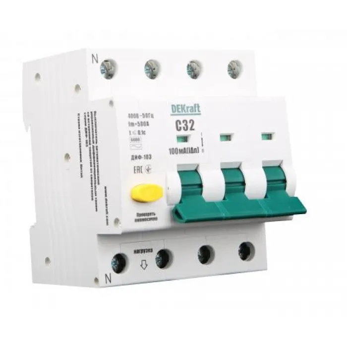 Дифавтомат DEKraft ДИФ-103 3P+N 32А ( C ) 6 кА, 30 мА ( AC ), 16215DEK - это устройство, предназначенное для защиты электрических цепей от перегрузок и коротких замыканий. Он обеспечивает надежную защиту и автоматическое отключение электропитания в случае возникновения неисправностей.Дифавтомат DEKraft ДИФ-103 имеет три полюса и нейтральный полюс (3P+N), что позволяет использовать его для защиты трехфазных цепей. Максимальная номинальная токовая нагрузка составляет 32А, что позволяет использовать его в различных электрических системах.