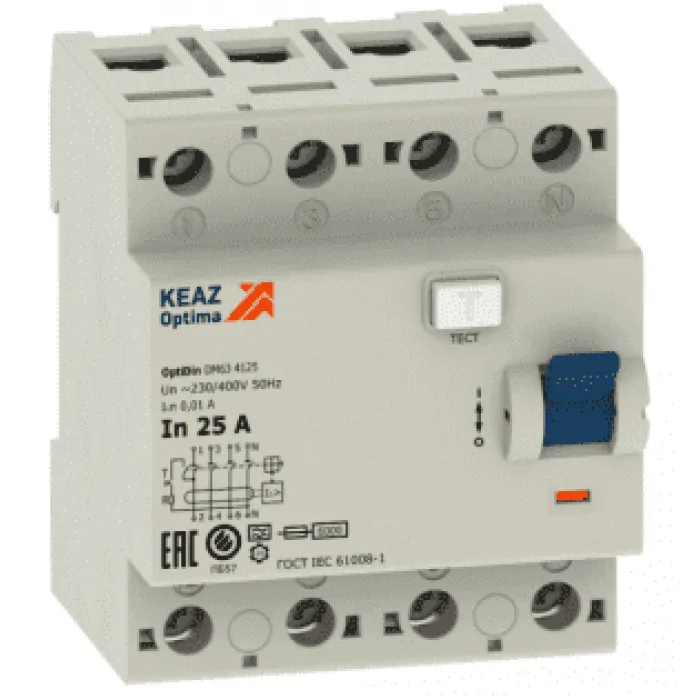 В нашем магазине Главэлектрика в Нижнем Новгороде, вы можете приобрести с доставкой по Нижнему Новгороду товар УЗО КЭАЗ OptiDin DМ63 4P 25А 6 кА, 30 мА ( AC ), 254201.
