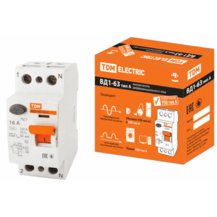 УЗО TDM УЗО ВД1-63 тип А 2P 16А, 30 мА ( AC ), SQ0203-0074, Нижний Новгород