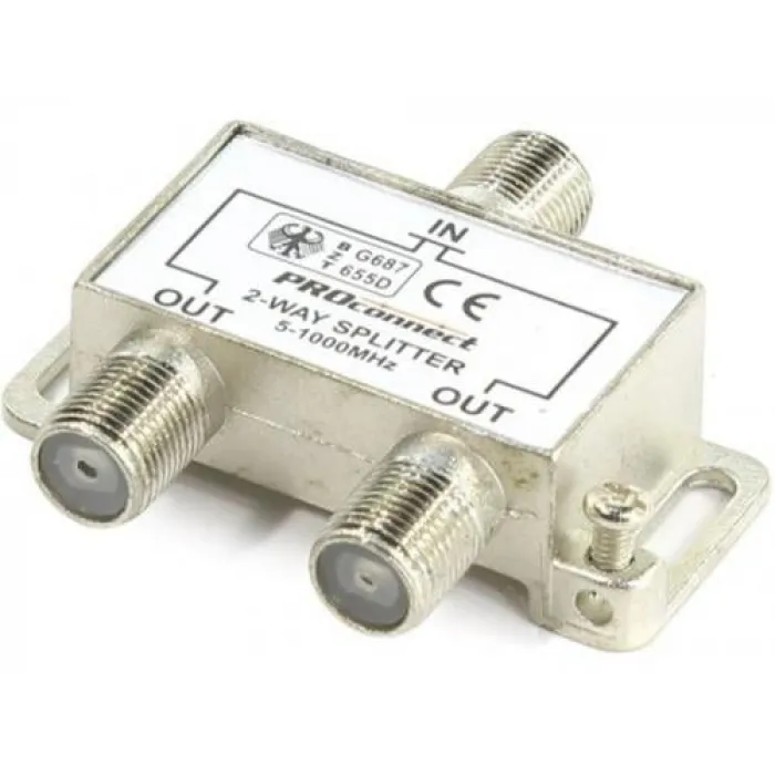 Антенный разветвитель незаменим в любой системе эфирного телевидения, а также в бытовых условиях, когда необходимо подключить к одной антенне несколько телеприемников. Делитель ТВ на 2 выхода под F-разъем предназначен для деления телевизионного сигнала, идущего от антенны к оборудованию, равномерно на число выходов. Данный ТВ краб на 2 выхода под F разъём PROCONNECT имеет два выхода, т. е. сигнал, проходящий через сплиттер, делится пополам. Кабель подключается к этому делителю с помощью F-разъем