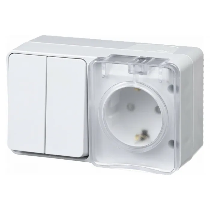 Блок: розетка 2Р+Е шторки 16А + 2-к выкл. 10А открытой установки IP54 SE AtlasDesign Profi54, белый, Нижний Новгород