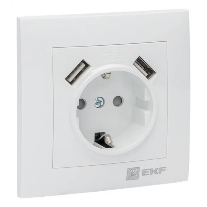 Розетка c 2xUSB EKF ВАЛЕНСИЯ, скрытый монтаж, с заземлением, со шторками, белый, EWR16-028-10-2USB, Нижний Новгород
