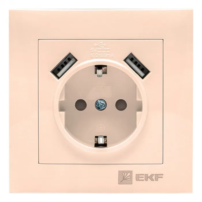 Розетка c 2xUSB EKF ВАЛЕНСИЯ, скрытый монтаж, с заземлением, со шторками, кремовый, EWR16-028-20-2USB, Нижний Новгород