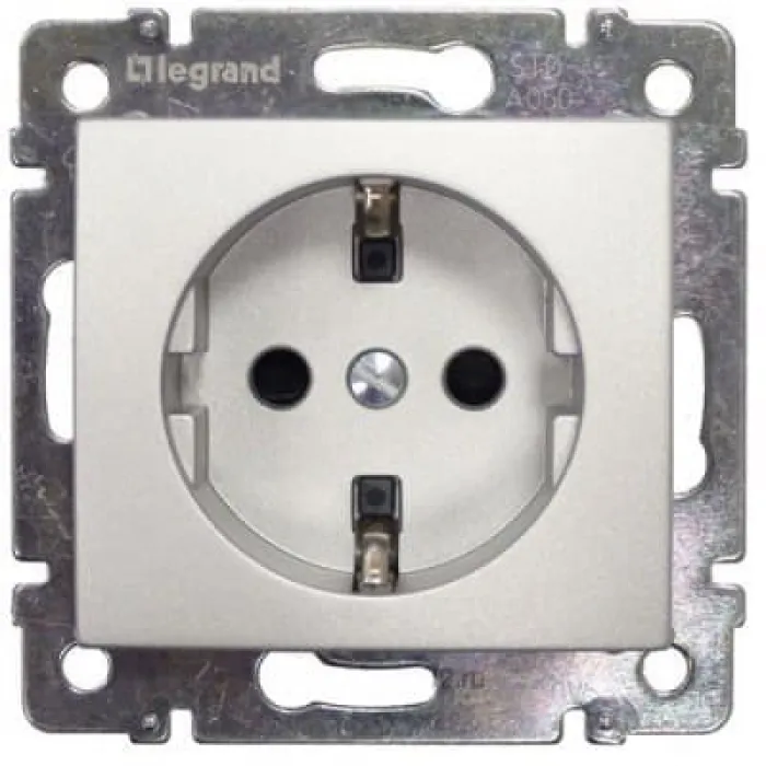 Legrand 770211Розетка электрическая LEGRAND 770211 имеет немецкий стандарт типа Schuko. Конструкция представляет из себя 2 контакта питания и один контакт заземления. Поставляется без рамки Legrand серии Valena, с автоматическими зажимами. Имеет защитные шторки. Допустимая нагрузка 16А. Размер 58x51мм. Цвет: Алюминий.