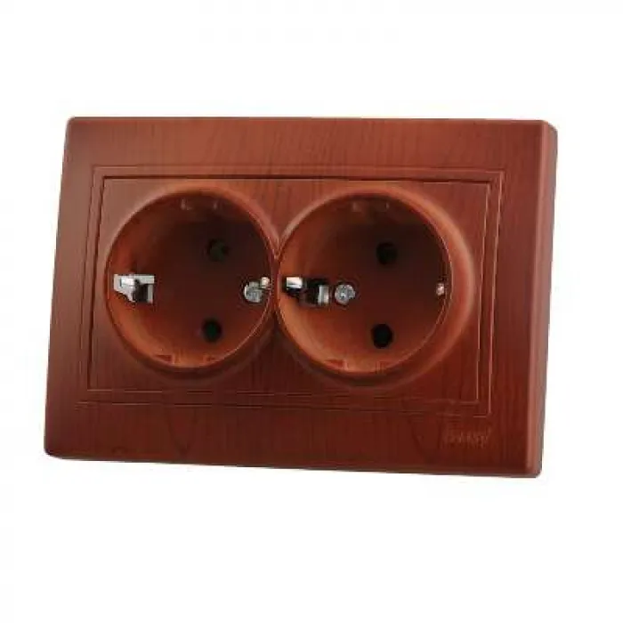 Розетка двойная з/к (керамика). Изделия с расцветкой «под дерево» изготовлены из покрашенного «под фактуру» пластика, а не оклеены цветной пленкой. Безопасные для рук крепежные выступы с пружиной и возвратом в исходное положение. Серебряные контакты, выполнены по стандарту из сплава. Опорна плата с маркировкой, на все изделия нанесены схемы электрического соединения. Надежные соединения с помощью шайб с насечкой. Простой монтаж и демонтаж. Нержавеющий металлический каркас. Защита пальцев. Напря