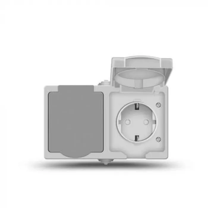 Продукт имеет степень защиты IP-54, что гарантирует его надежность и защиту от пыли и влаги. Крышка, входящая в комплект, обеспечивает дополнительную защиту от пыли и воды, когда розетка не используется.