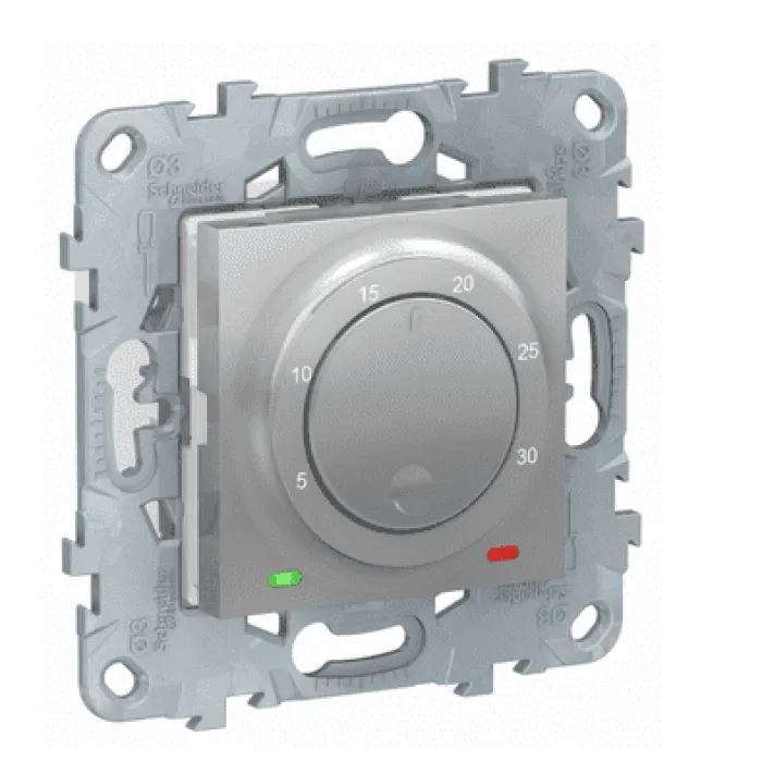 Термостат электронный 8А со встроенным термодатчиком SE Unica NEW, алюминий - это современное устройство для автоматического контроля и регулирования температуры в помещении. Он оснащен встроенным термодатчиком, который позволяет точно измерять температуру и поддерживать заданный уровень комфорта.Этот термостат имеет максимальную нагрузку до 8А, что обеспечивает возможность управления отопительным оборудованием большей мощности. Корпус из алюминия делает его прочным и надежным в использовании.