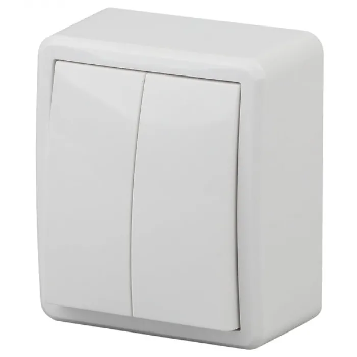 Данный выключатель обладает двойной конструкцией, что позволяет управлять двумя независимыми электрическими цепями одновременно. Он имеет степень защиты IP54, что обеспечивает надежную защиту от пыли и влаги, что делает его подходящим для использования внутри и снаружи помещений.