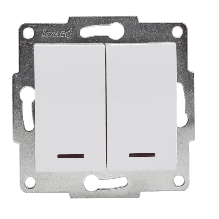 Механизм выключателя двухклавишного типа с защитой от пыли и влаги IP20. Имеет подсветку, которая помогает найти выключатель в темноте. Производитель - Lezard. Максимальный ток - 10А. Отличное качество и надежность от бренда KARINA. Подходит для использования в доме, офисе или других помещениях.